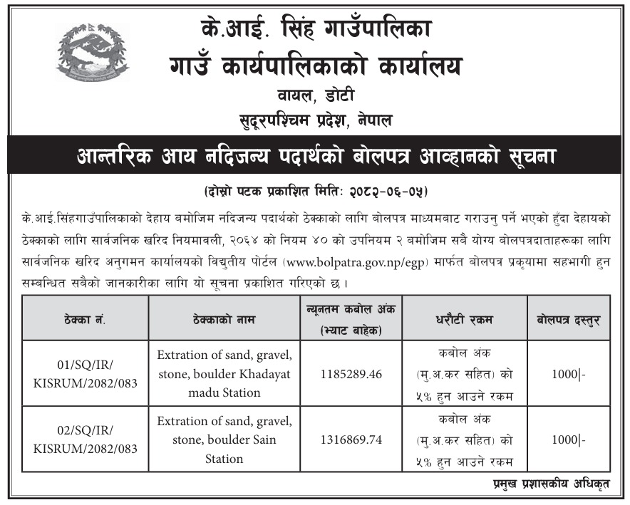 आन्तरिक आय नदिजन्य पदार्थको बोलपत्र आव्हानको सूचना (दोस्रो पटक प्रकाशित)।