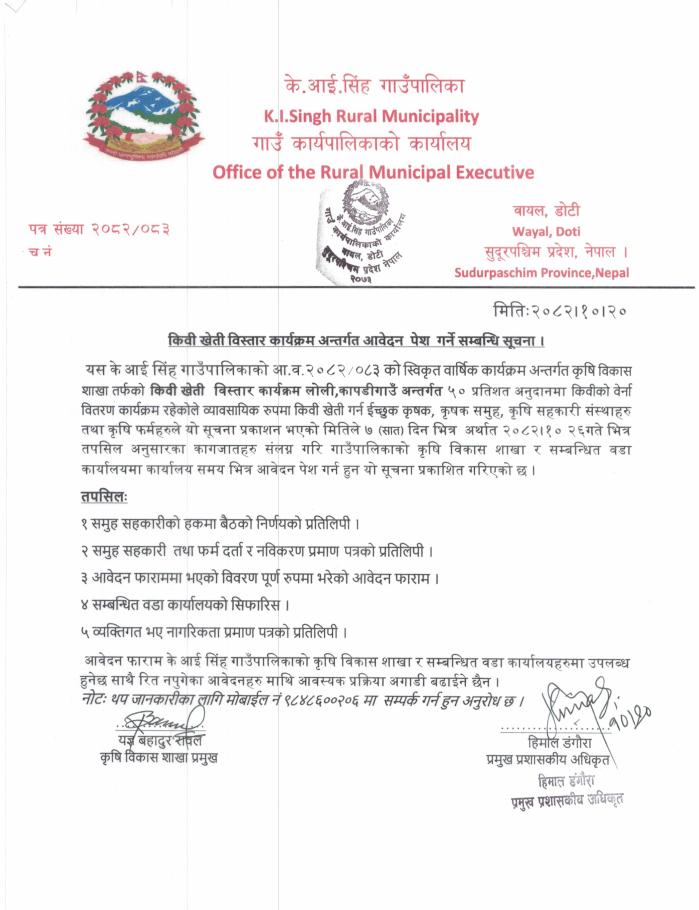 किवी खेती विस्तार कार्यक्रम अन्तर्गत आवेदन पेश गर्ने सम्बन्धी सूचना।