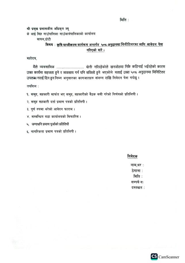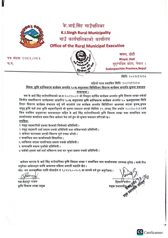 कृषि यान्त्रीकरण कार्यक्रम अन्तर्गत ५०% अनुदानमा मिनिटिलर वितरण कार्यक्रम अन्तर्गत सूचना प्रकाशन सम्बन्धमा ।