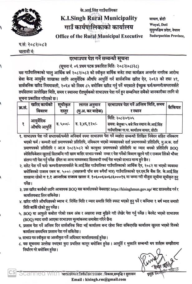 दरभाउपत्र पेश गर्ने सम्बन्धी सूचना (आयुर्वेदिक औषधि आपुर्ति)।