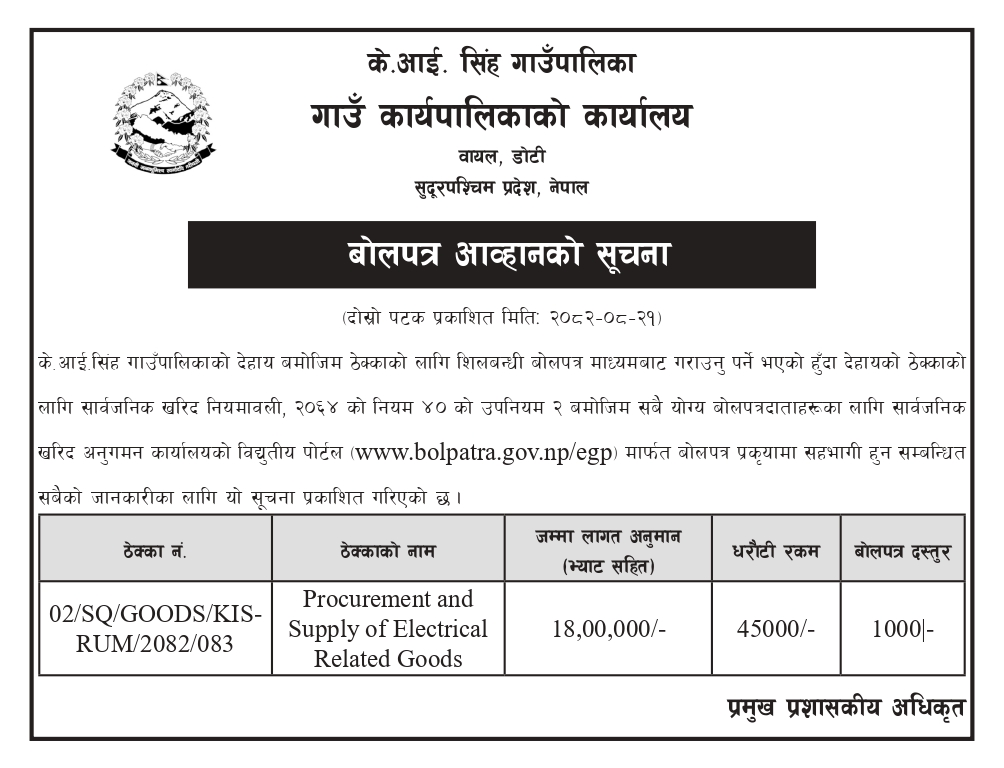 बोलपत्र आव्हानको सूचना (दोस्रो पटक प्रकाशित मितिः२०८२्/०८/२१)- Procurement & Supply of electric related goods.