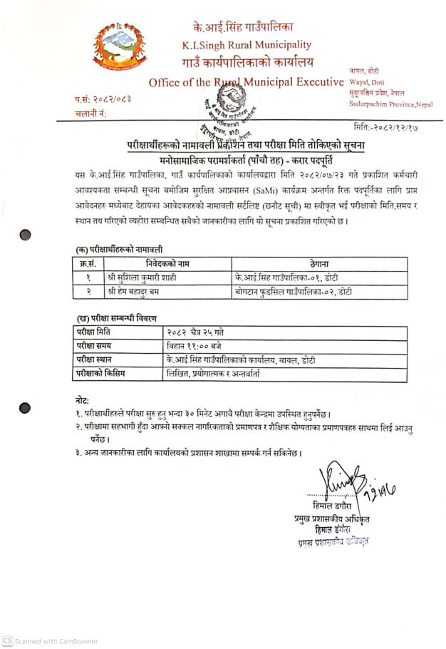 मनोसामाजिक परामर्शकर्ता (पाँचौ तह) - करार पदपूर्तिका लागि परीक्षार्थीहरूको नामावली प्रकाशन तथा परीक्षा मिति तोकिएको सम्बन्धी सूचना।