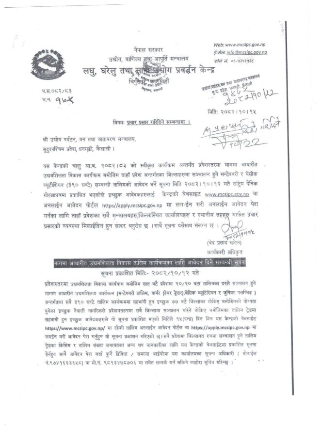 मागमा आधारित उद्यमशीलता विकास तालिम कार्यक्रमका लागि आवेदन दिने सम्बन्धी लघु, घरेलु तथा साना उद्योग प्रवर्द्धन केन्द्रको सूचना।