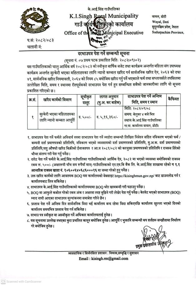 दरभाउपत्र पेश गर्ने सम्बन्धी सूचना (सुत्केरी भएका महिलाहरूका लागि न्यानो कम्बल आपुर्ति)।