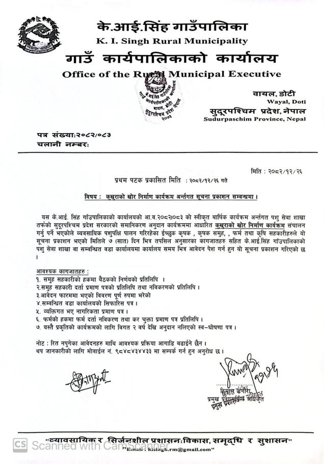 कुखुराको खोर निर्माण कार्यक्रम अन्तर्गत सूचना प्रकाशन सम्बन्धमा ।