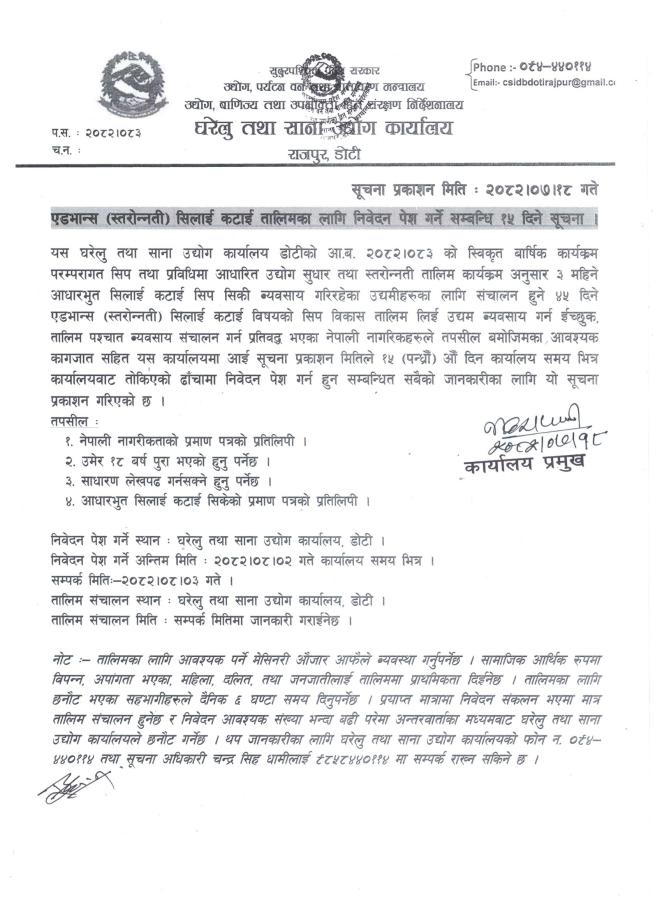 एडभान्स (स्तरोन्नती) सिलाई कटाई तालिमका लागि निवेदन पेश गर्ने सम्बन्धि घरेलु तथा साना उद्योग कार्यालय, राजपुर, डोटिको १५ दिने सूचना ।
