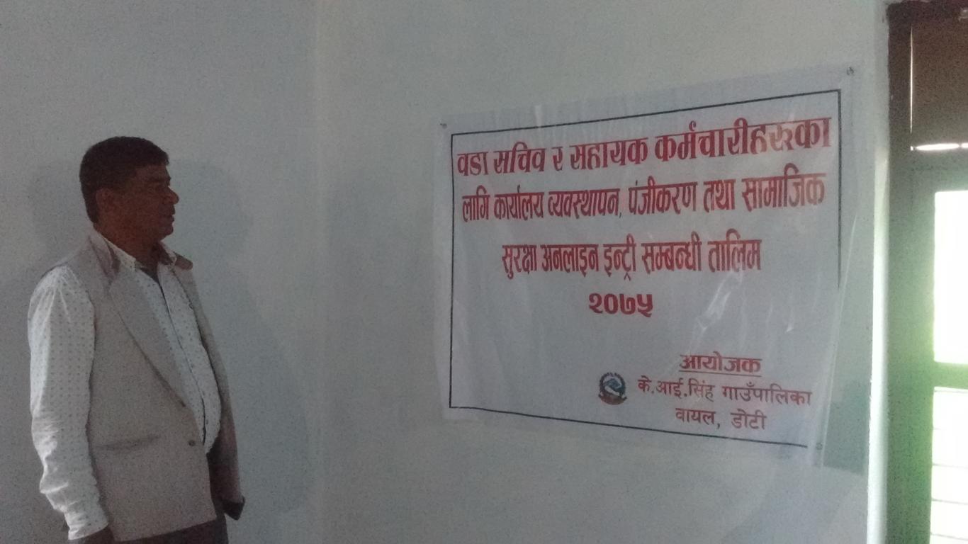 वडा सचिव र सहायक कर्मचारीहरुको लागि राखेको कार्यालय व्यवस्थापन, पञ्जिकरण तथा सामाजिक सुरक्षा अनलाइन इन्ट्री सम्बन्धि तालिम २०७५ सम्पन्न भएको छ । करिव ५ दिन सम्म चलेको तालिमको उद्घाटन के.आई.सिंह गा.पा. अध्यक्ष श्री लोकेन्द्र बहादुर शाही ले गर्नु भएको थियो । तालिम उद्घाटन कार्यक्रममा के.आईं.सिंह गा.पा.का उपाध्यक्ष श्री मिना देवि बिष्ट लगायत विभिन्न विषयगत कार्यालय प्रमुख को पनि उपस्थिति थियो । के.आईं.सिंह गा.पा. भित्रका सम्पूर्ण वडा सचिव र सहायक कर्मचारीहरुलाई पञ्जिकरण तथा सामाजिक सुरक्षा अनलाइन इन्ट्रीमा सिपवृद्धिको लागि दिइएको तालिम निकै नै फलदायी भएको छ । कार्यालय व्यस्थापनको प्रशिक्षण के.आईं.सिंह गा.पा. प्रमुख प्रशाकीय अधिकृृत श्री सिद्धराज शर्माले गर्नु भयो , त्यस्तै पञ्चिकरण सम्बन्धि प्रशिक्षण पत्रकार तथा मानवअधिकारकर्मी श्री रामहरी ओझा ले गर्नु भयो, अनलाइन इन्ट्रि सम्बन्धि प्रशिक्षण सुचना प्रविधि अधिकृृत श्री तेजबहादुर साउदले गर्नु भयो र सुचनाको हक सम्बन्धि ऐनको प्रभावकारी प्रशिक्षण पत्रकार महासंघ डोटीका सचिव तथा रडियो डोटी का श्री गणेश मौनिले गर्नु भयो भने तालिममा त्रिवेणि एफ.एम. का स्टेशन म्यानेजर श्री कर्र्ण बहादुर चन्द पनि उपस्थित हुनुहुन्थ्यो ।