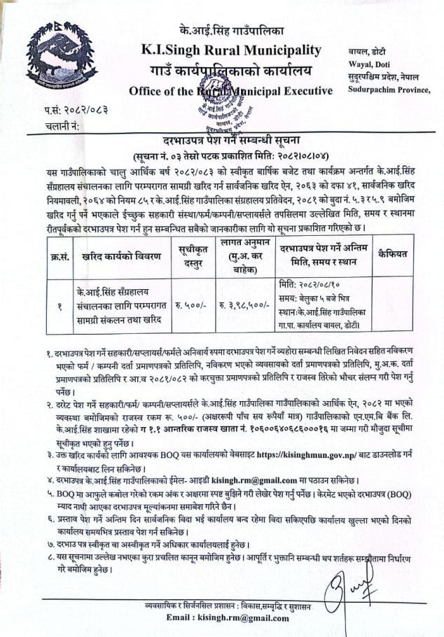 के.आई.सिंह सँग्रहालय सञ्चालनका लागी दरभाउपत्र पेश गर्ने सम्बन्धी सूचना (तेस्रो पटक प्रकािशित मितिः२०८२/०८/०४)।
