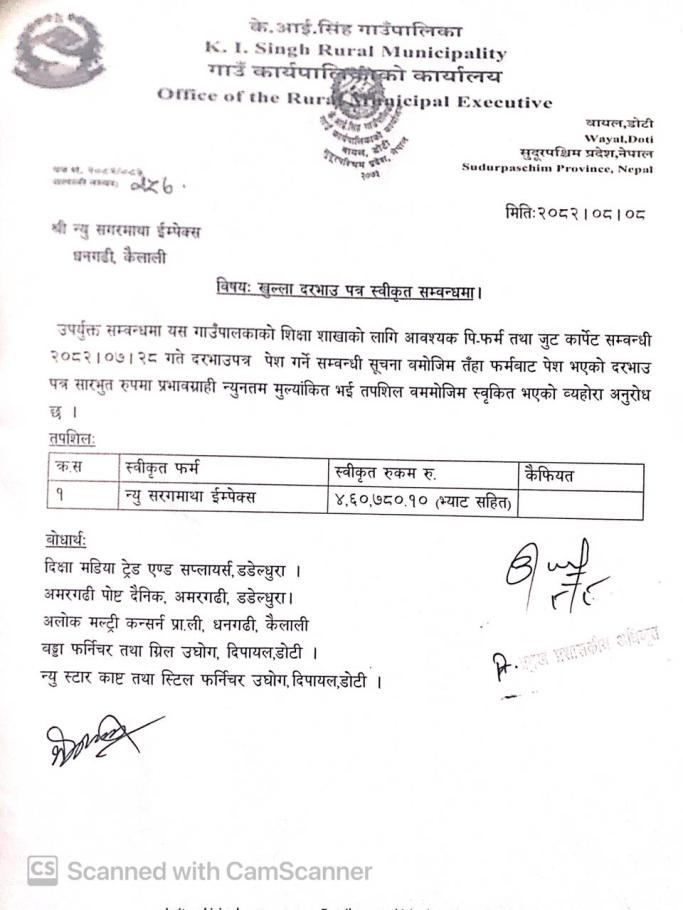 खुल्ला दरभाउपत्र स्वीकृत सम्बन्धमा (शिक्षा शाखाका लागी आवश्यक पि फर्म तथा जुट कार्पेट खरिद सम्बन्धी)।)