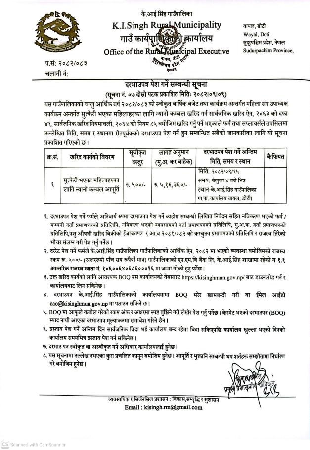 दरभाउपत्र पेश गर्ने सम्बन्धी सूचना (दोस्रो पटक प्रकाशित मिति २०८२/०९/०९)-सुत्केरी भएका महिलाहरूका लागि न्यानो कम्बल आपुर्ति।