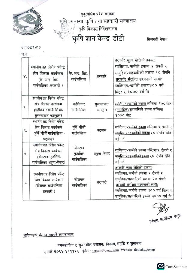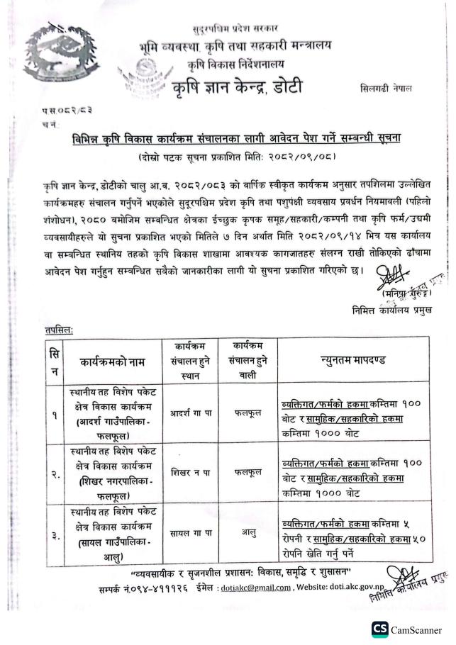 बिभिन्न कृषि विकास कार्यक्रम संचालनका लागि आवेदन पेश गर्ने सम्बन्धी कृषि ज्ञान केन्द्र, डोटीको सूचना ।