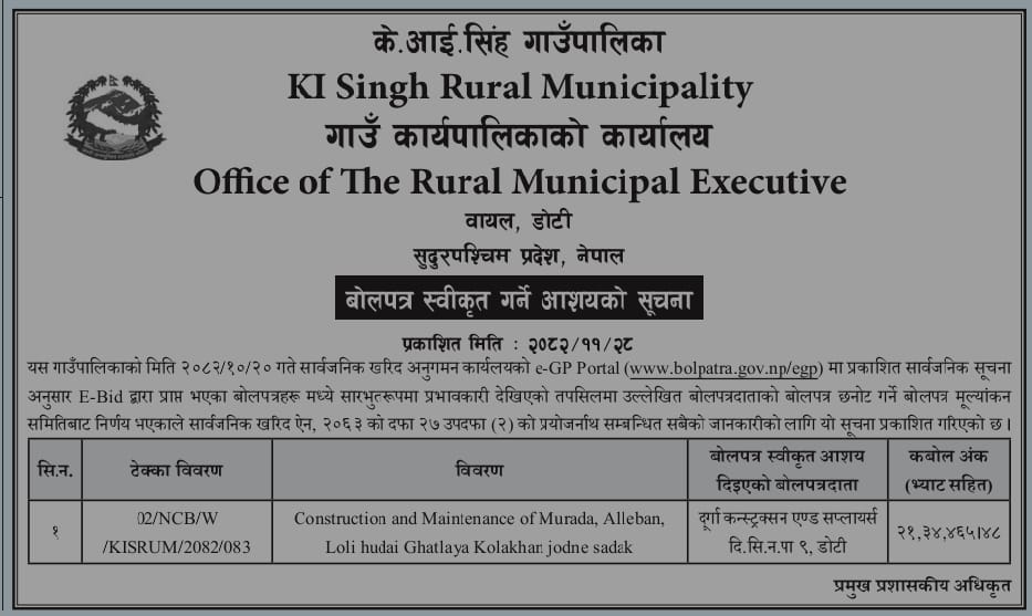 बोलपत्र स्वीकृत गर्ने आशयको सूचना (02/NCB/W/KISRUM/2082/083).