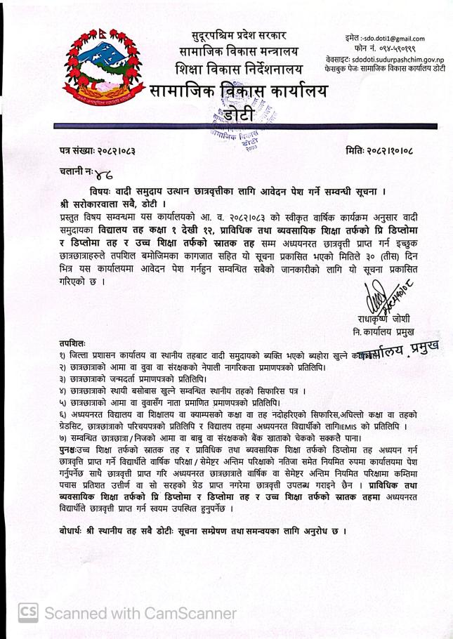 वादी समुदाय उत्थान छात्रवृत्तीका लागि आवेदन पेश गर्ने सम्वन्धी सामाजिक विकास कार्यालय डोटीको सूचना ।