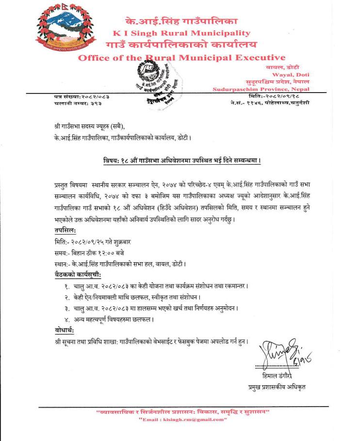 १८ औं गाउँसभा (हिउँदे) अधिवेशनमा उपस्थित भई दिने सम्बन्धी सूचना।
